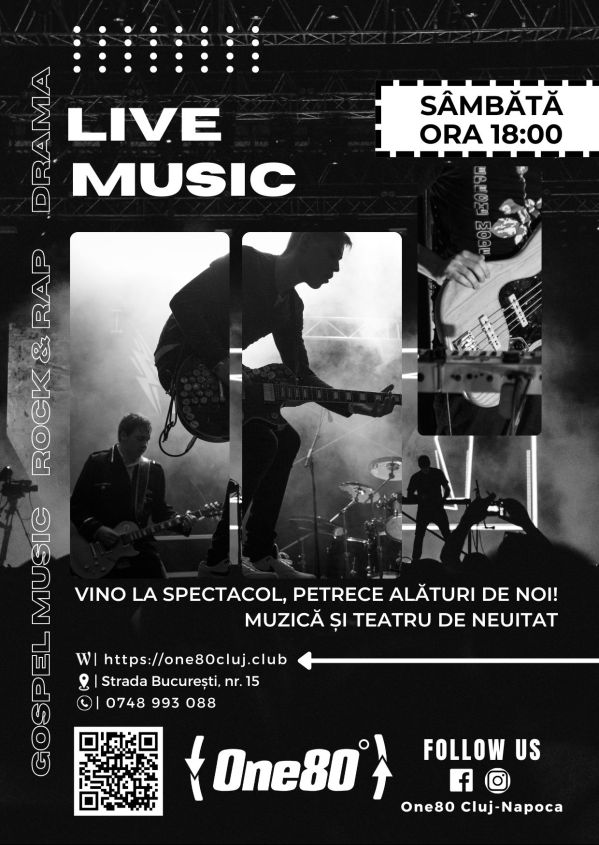 „One80 Club” Cluj-Napoca vă invită să vă petreceți seara de sâmbătă alături de noi. Am pregătit pentru voi un spectacol format din piese de teatru și muzică live.
