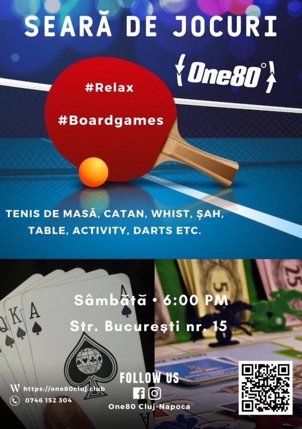 Sâmbătă, 29 Noiembrie 2025, de la ora 18:00, clubul „One80” vă invită la o seară de jocuri. Relaxați-vă alături de noi cu activități precum tenis de masă sau jocuri de societate (Activity, Catan, Dixit, Alias, Whist) și strategie (Șah, Table).